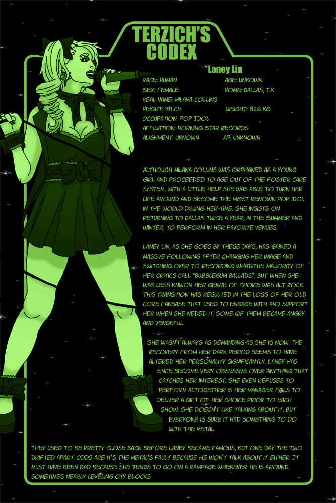 She used to be rather shy and socially awkward, but now she acts a lot like The Metal after shadowing him for a couple years. Laney used to be a lot more of a tomboy and got along well with the rest of the Professional Freelancers. She started dolling up more the higher her confidence grew, for several reasons, and today she appears as girly as any pop idol. Despite the glamour, she is still very much the “dude” with which they used to hang.