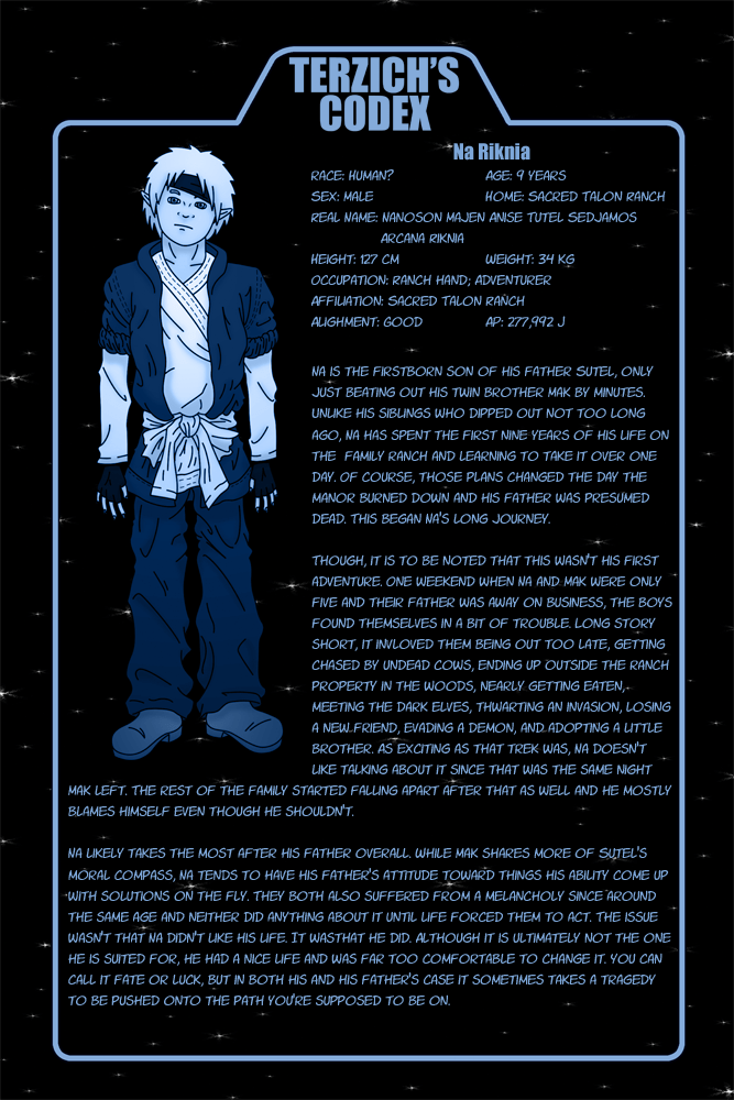 Na grew up on his family ranch along with his father Sutel, adopted older brother Rascal, older sister Anna, identical twin Mak, his adopted younger brother Cole’den, and more workers over the years than he can remember. His real journey began one day when his family home caught aflame and his father was presumed dead, although it was actually not his first adventure.
