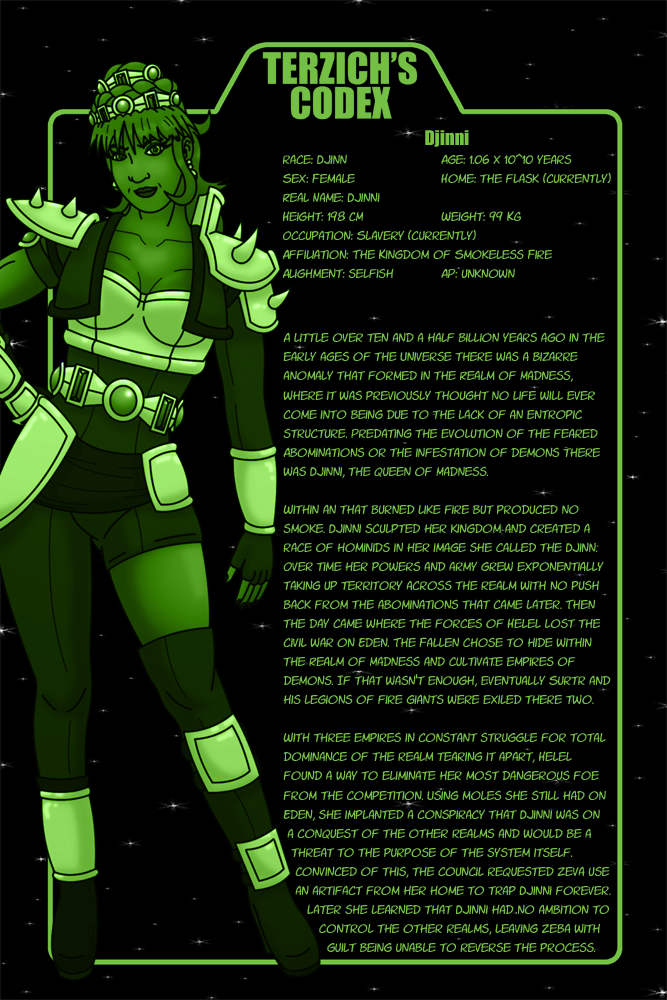 Not many know how the flask got away from Eden and began circulating into the hands of various individuals throughout the universe, but many know what happens should you find it in your possession. As a prisoner of the flask Djinni is compelled to fulfill the first three declared desires, within her power, of anyone who possesses it. Of course, that doesn’t mean she has to stop there. Djinni could fulfill as many additional desires as it pleases her. She isn’t just no longer compelled to fulfill desires after the first three are met. However, be careful should who declare a desire as you are dealing with a godly entity with powers based in the corruption that is Madness.