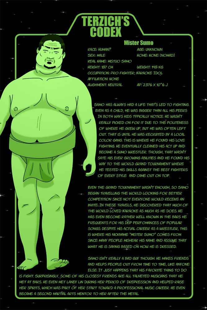 He likely also had the ability and just didn’t realize it until much later in life, but Samo has the abnormal ability to mitigate kinetic energy using the fat storage of his body. It isn’t known what the upper limit of this power is, though it is definitely more potent than it used to be and has even stopped trucks in their tracks. Combined with his ever-growing herculean strength, this makes Samo and extremely difficult opponent to surmount. In addition, he has also learned several languages along his journeys. He [mostly] fluently speaks Japanese, English, Mandarin, French, German, Spanish, Russian, Swahili, and Arabic.